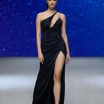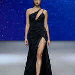 Step into ethereal elegance with the Celestial Slit Symphony Gown. This striking design features a flowing silhouette with a daring thigh-high slit, adorned with iridescent beadwork that catches the light like a starry night. Perfect for gala evenings or upscale soirées, its luxurious texture and celestial charm create a timeless statement.