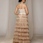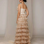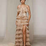 Elevate your elegance with Natacha Van's Champagne Tiered Lace Maxi Dress. This breathtaking gown features intricate lace embroidery and cascading tiers of delicate fabric, highlighted by a daring thigh-high slit. Perfect for gala evenings or sophisticated soirées, its flowing silhouette and luxurious texture make a striking statement of modern romance.