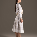 NATACHA VAN's creation combines a cream fitted jacket with a matching pleated midi skirt, perfect for boardroom leadership events or high-fashion business conferences where a statement of sophistication is required.