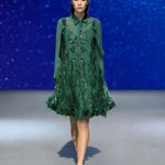 Inspired by the ethereal charm of "Midnight Mirage," the Emerald Fairy Bloom Dress showcases a lush olive green gown with delicate lace and flowing layers, perfect for garden weddings. Its whimsical design embodies timeless sophistication.