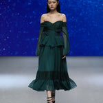 Inspired by the dreamy essence of "Midnight Mirage," the Emerald Whisper Ruffle Gown features a lush olive green silhouette with layered ruffles, evoking a fairy’s gentle movement. Perfect for gala evenings, its elegance captivates.