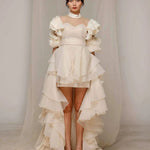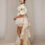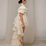 Step into opulence with Natacha Van's Ivory Asymmetrical Ruffle Gown. This striking design features dramatic ruffle cascades and a high-low hem, crafted for a bold silhouette. Perfect for red-carpet events or lavish galas where its avant-garde elegance steals the spotlight.