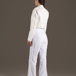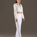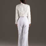 This NATACHA VAN set pairs an ivory cropped jacket with sophisticated fringe detail and sleek wide-leg trousers for a modern silhouette. A perfect ensemble for high-profile meetings or chic evening receptions, where fashion-forward professionalism is in the spotlight.