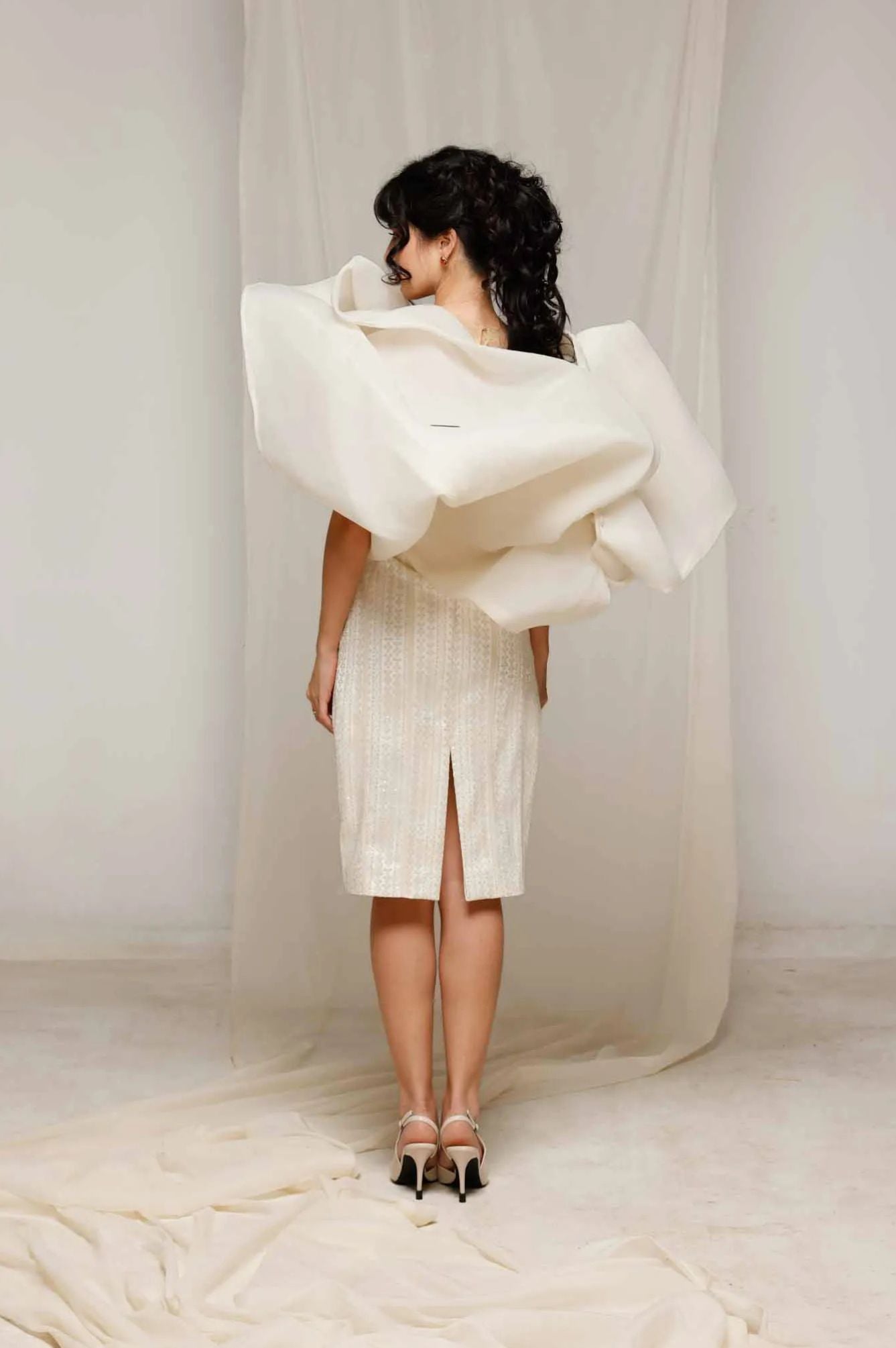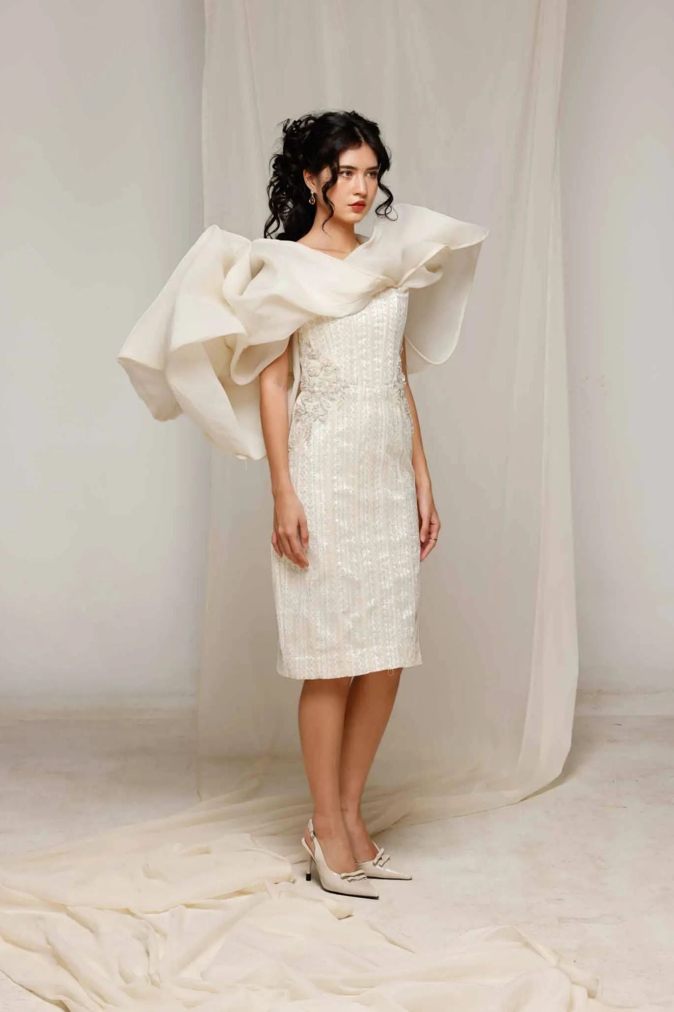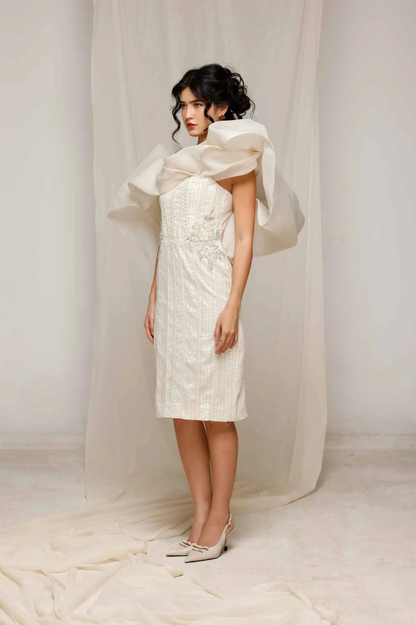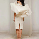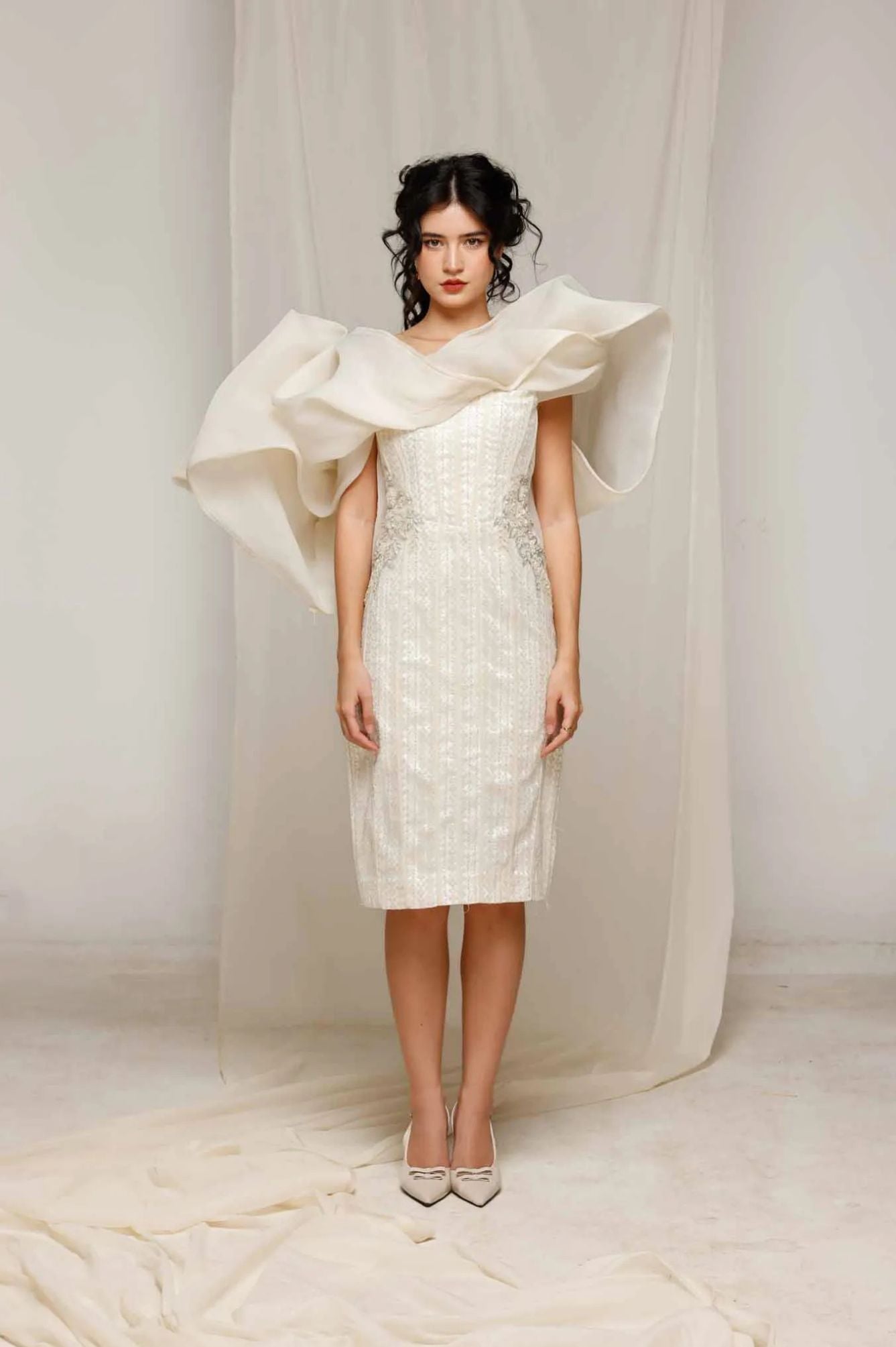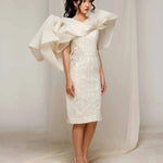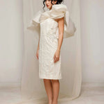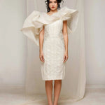 Elevate your elegance with Natacha Van's Ivory Embroidered Ruffle Midi Dress. This exquisite piece features a fitted bodice with intricate embroidery and dramatic ruffle accents, creating a harmonious blend of sophistication and flair. Ideal for gala evenings or upscale receptions, where its timeless ivory sheen and tailored silhouette shine.