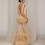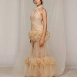 Capture ethereal grace with Natacha Van's Ivory Halter Ruffle Gown. This stunning design showcases a halter neckline with cascading ruffles and a flowing train, blending delicate elegance with bold flair. Perfect for wedding receptions or upscale galas, its lightweight fabric and intricate detailing create a timeless masterpiece.