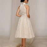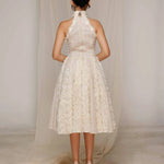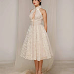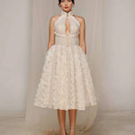 Unveil your grace with Natacha Van's Ivory Halter Ruffle Midi Dress. This stunning design features a high-neck halter top with intricate ruffle detailing, perfect for garden weddings or elegant soirées where its refined texture and flowing silhouette captivate.