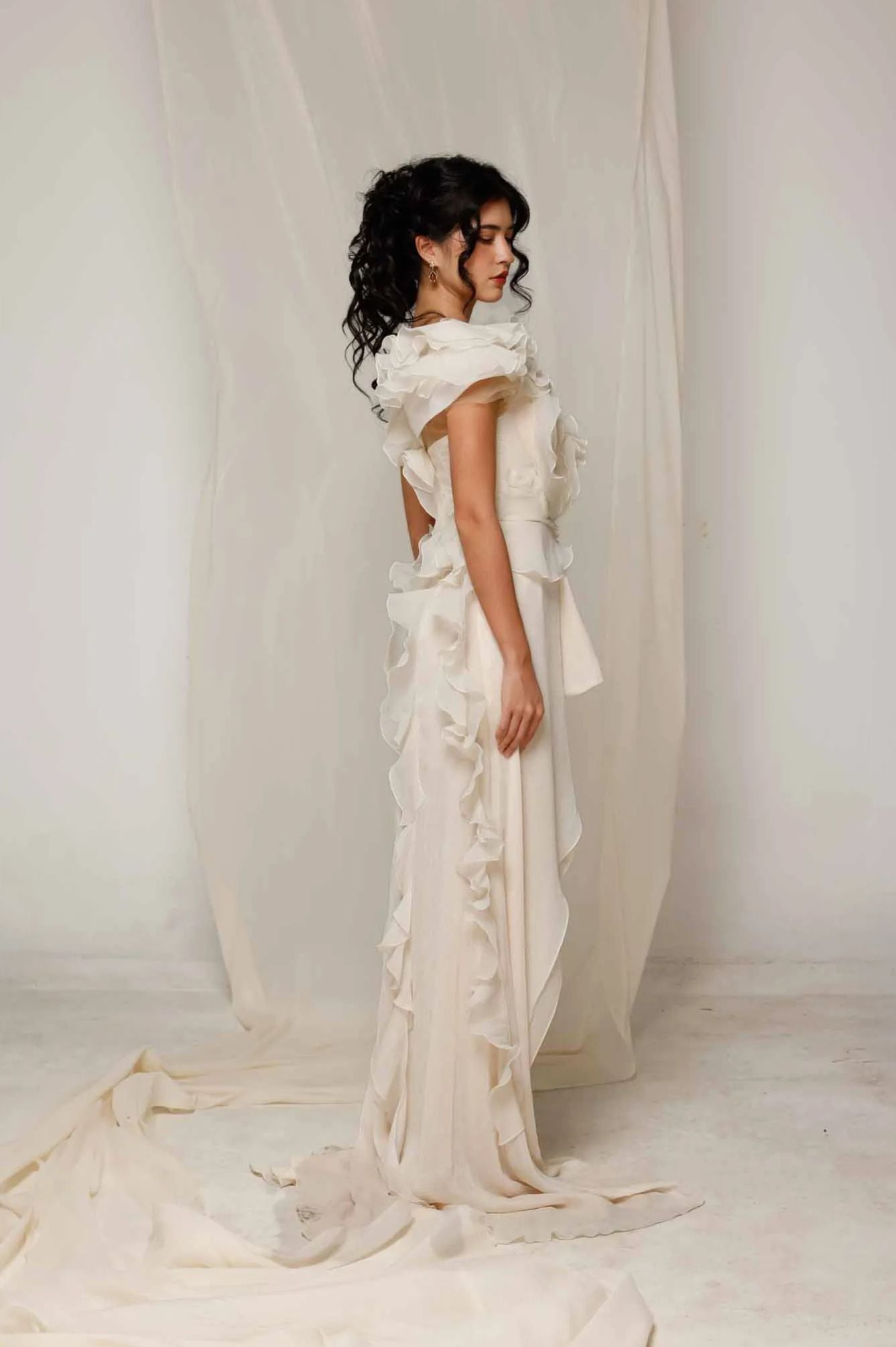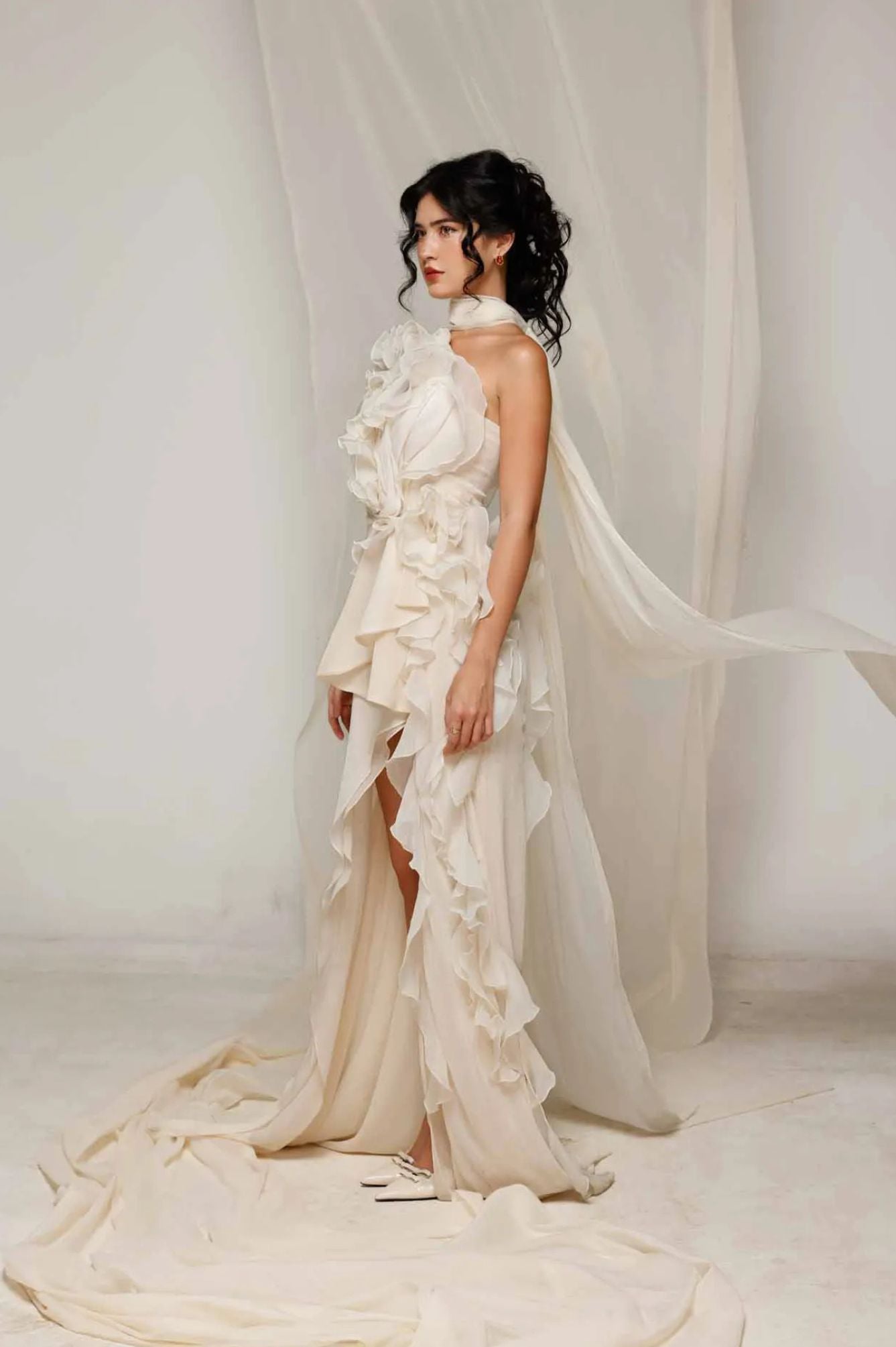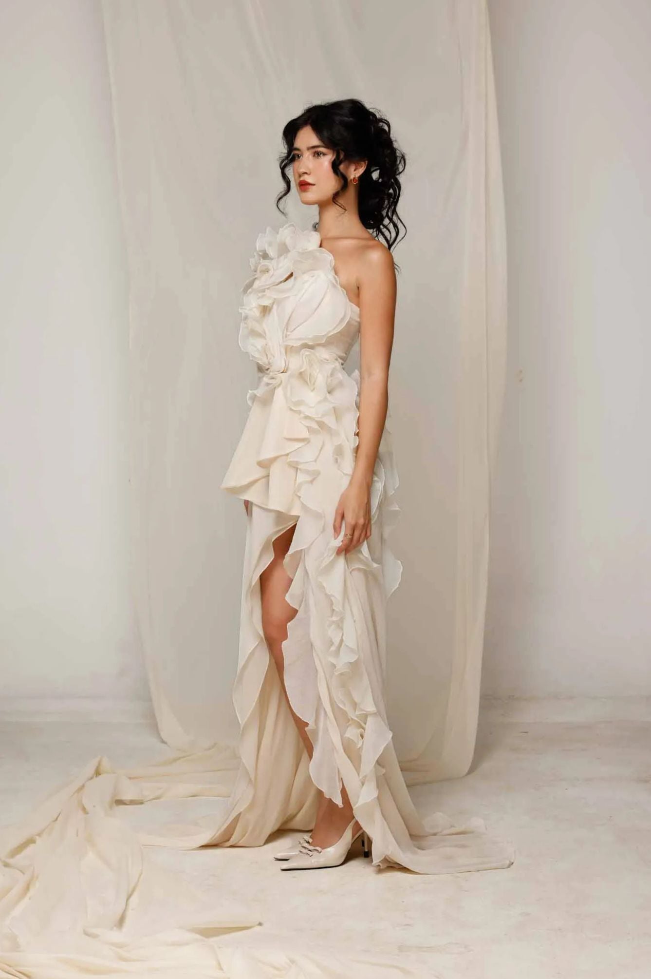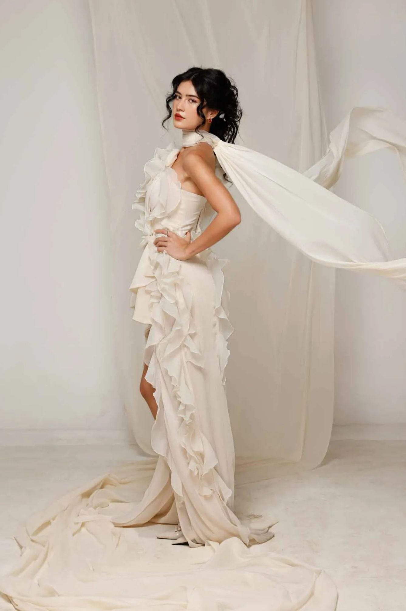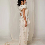 Unleash bold elegance with Natacha Van's Ivory Off-Shoulder Mini Dress with Train. This striking design features off-shoulder ruffles and intricate embroidery, paired with a dramatic train for a modern twist. Ideal for cocktail events or avant-garde soirées, its luxurious texture and unique silhouette command attention.