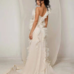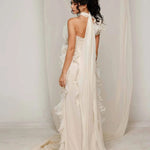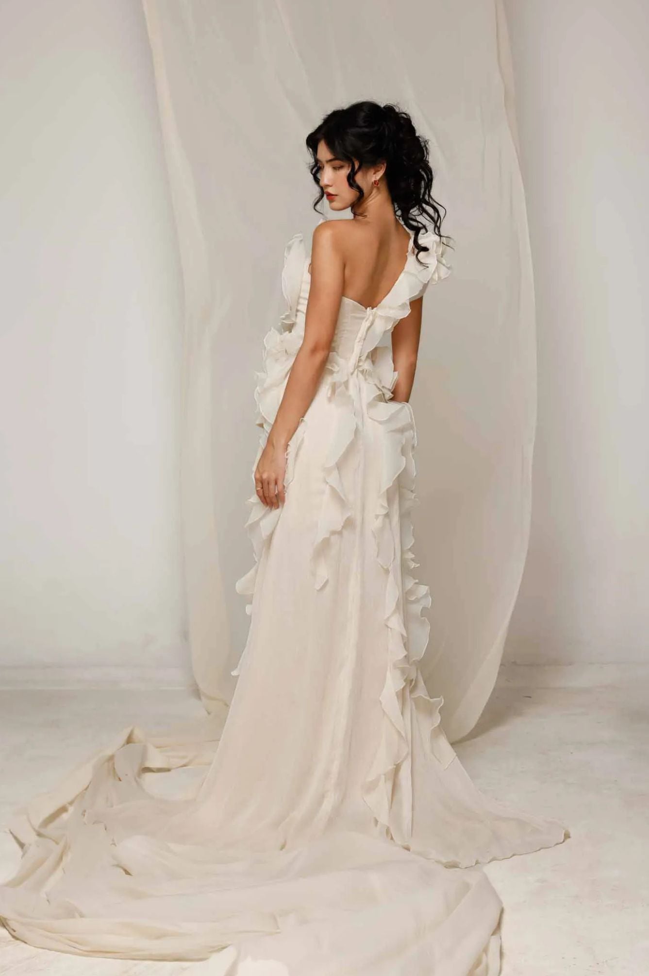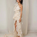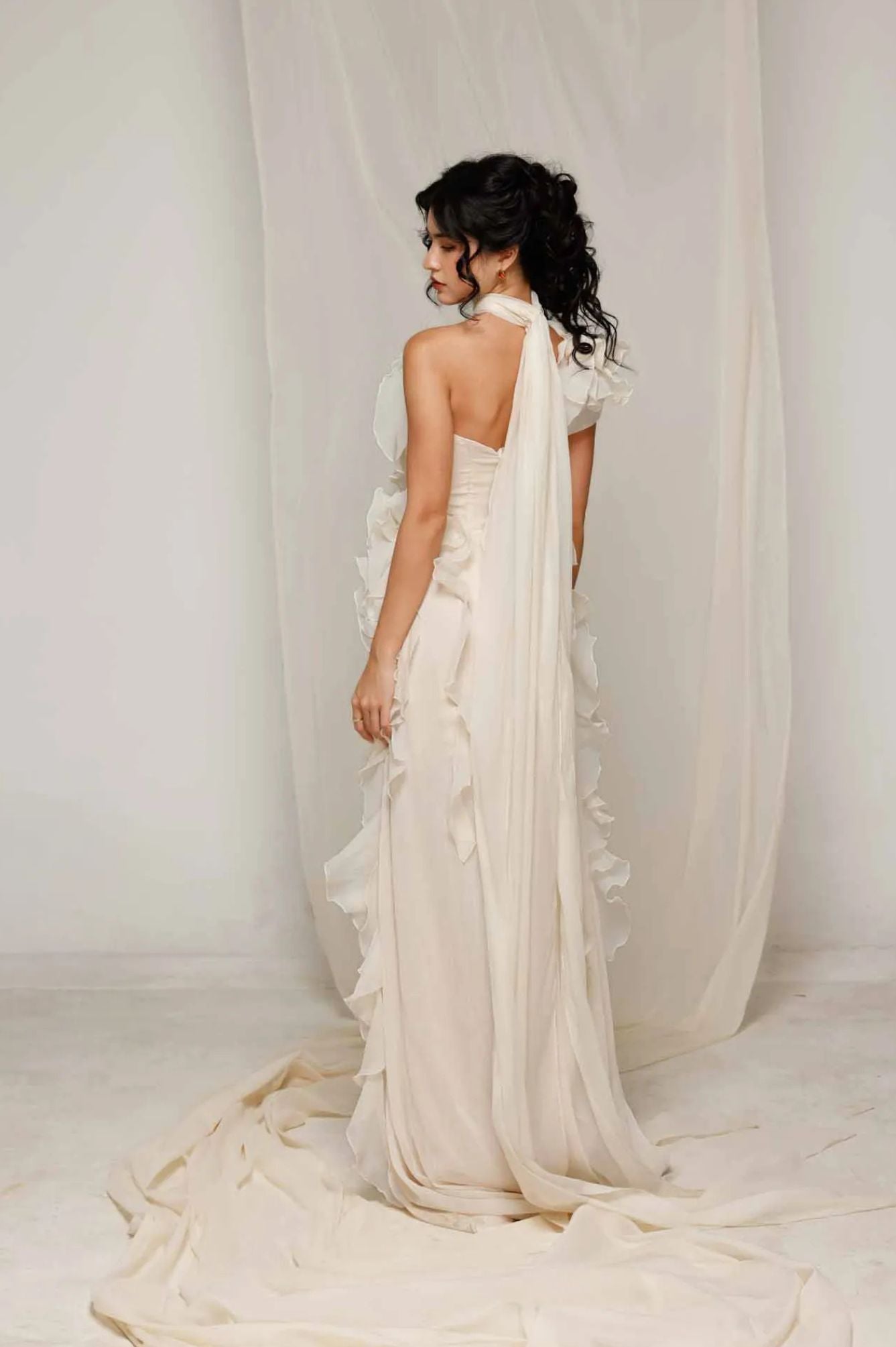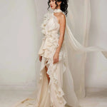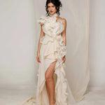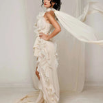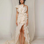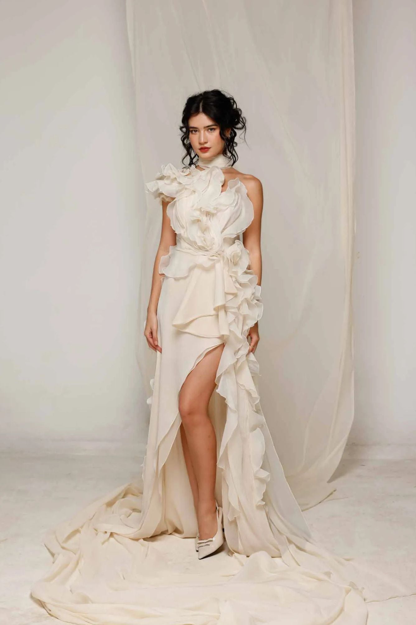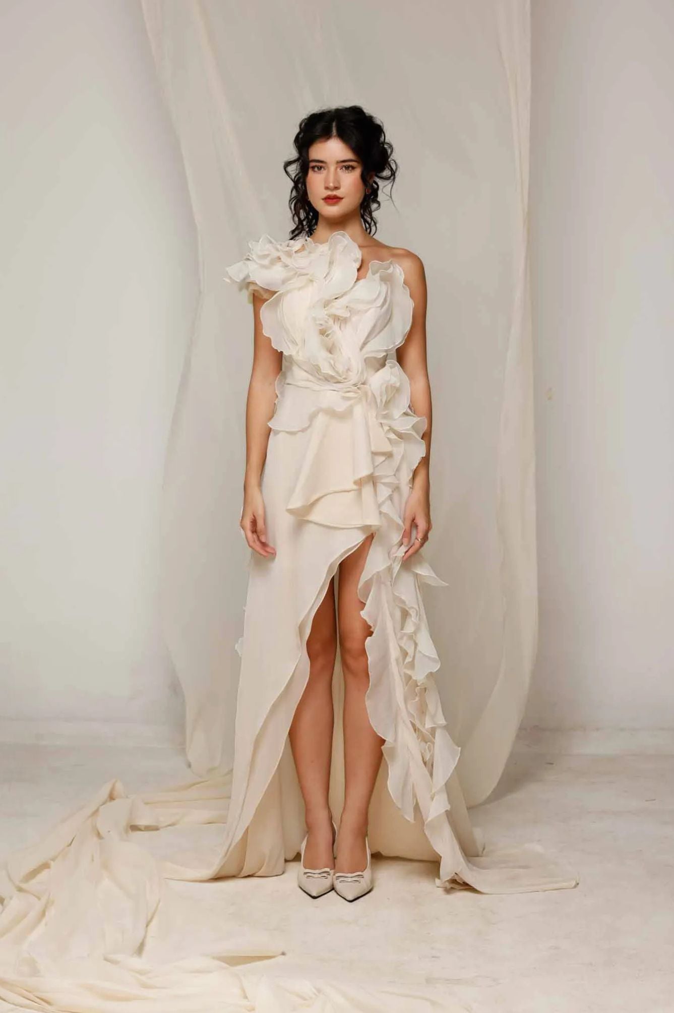 Unleash bold elegance with Natacha Van's Ivory Off-Shoulder Mini Dress with Train. This striking design features off-shoulder ruffles and intricate embroidery, paired with a dramatic train for a modern twist. Ideal for cocktail events or avant-garde soirées, its luxurious texture and unique silhouette command attention.