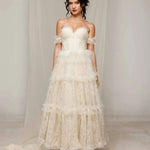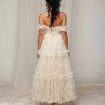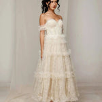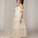 Exude ethereal beauty with Natacha Van's Ivory Off-Shoulder Tiered Maxi Dress. This elegant design features layered ruffles and delicate lace, crafted for a fairy-tale silhouette. Ideal for black-tie weddings or glamorous evening events where its timeless charm enchants.
