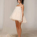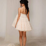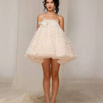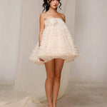 Embrace timeless elegance with Natacha Van's Ivory Strapless Ruffle Mini Dress. This captivating piece features a voluminous ruffle skirt and a delicate floral accent, crafted for a whimsical silhouette. Ideal for bridal showers or chic daytime celebrations where its romantic charm takes center stage.