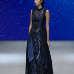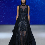 Capturing the ethereal magic of "Midnight Mirage," the Midnight Celestial Flow Gown in deep black features beadwork and flowing tulle, evoking a fairy’s graceful dance. Ideal for wedding receptions, its charm is unforgettable.