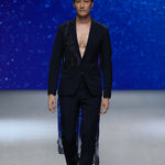 Inspired by the celestial beauty of "Midnight Mirage," the Stellar Night Embrace Suit in deep black features intricate embellishments, twirling with starry elegance. Ideal for upscale soirées, its charm captivates.
